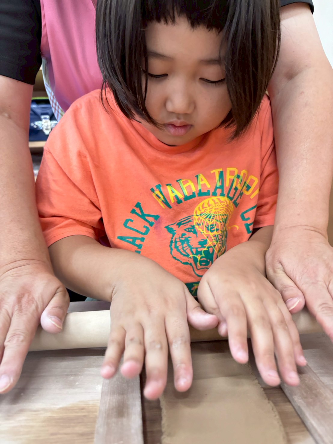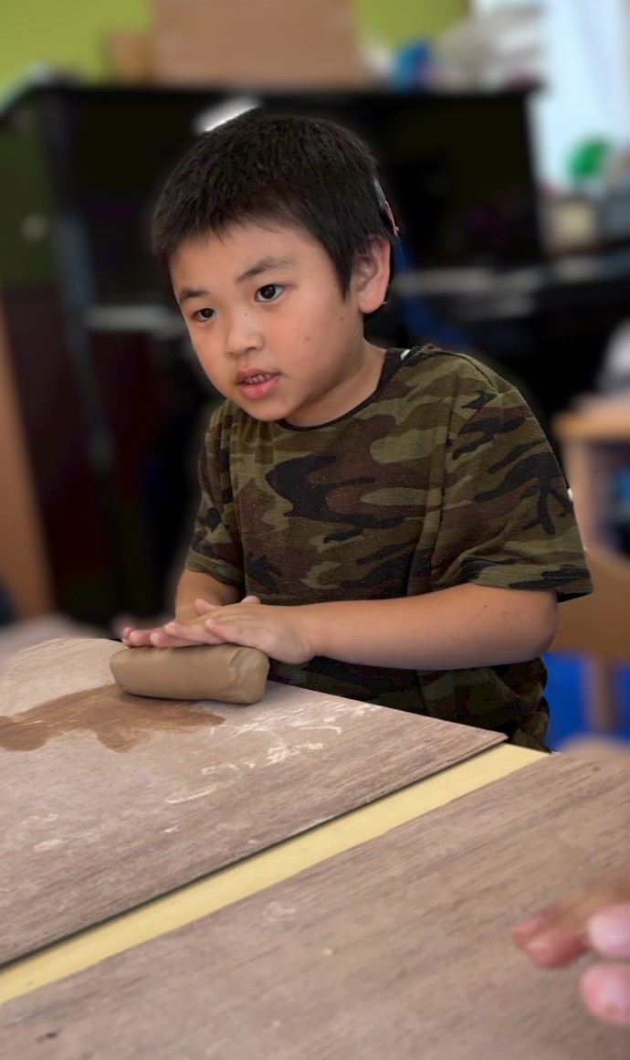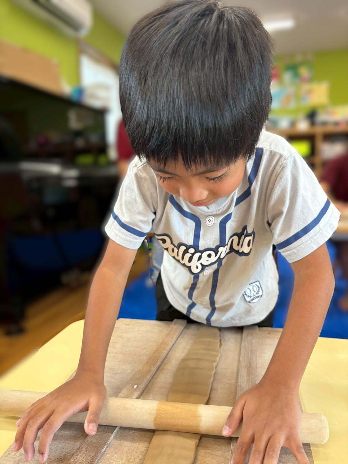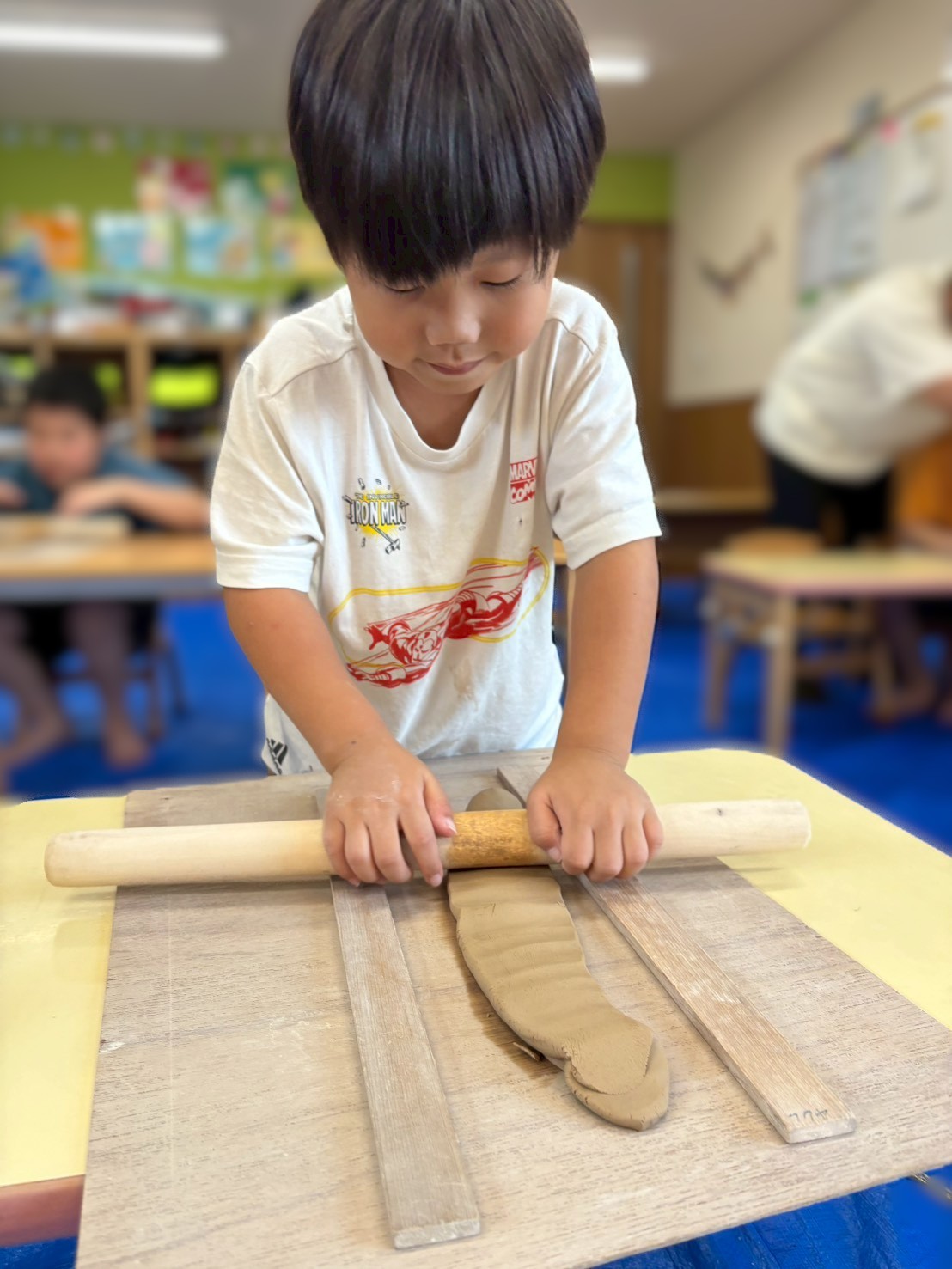 粘土を丸めた後、麺棒を使いながらさらに細長く伸ばして