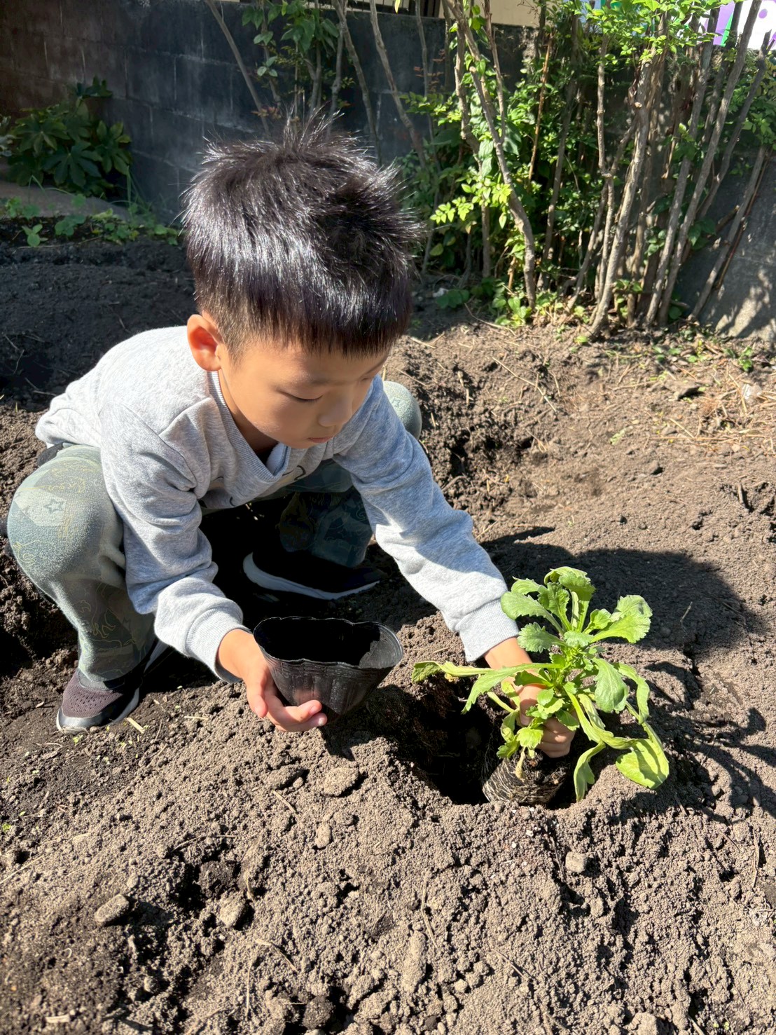 職員の説明を聞きながら、そっと野菜の苗を植えることが出来ました。