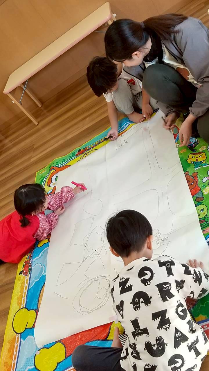 家の近くにあるお店の話しながら大きな紙に線を書き町を作ったり、