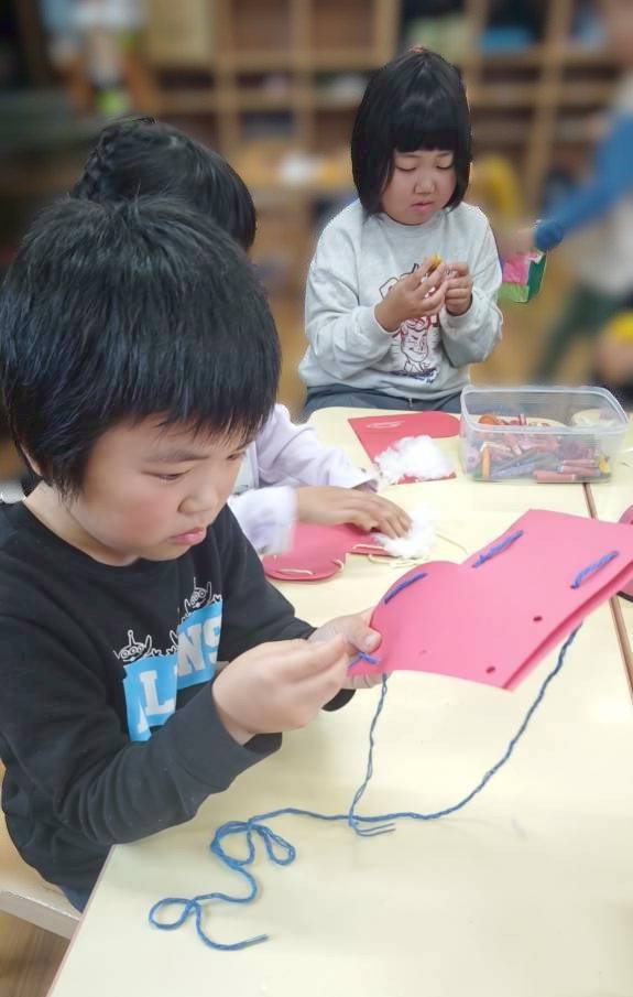 飾りのシールをはがして並べたり、ボンドでポンポンを付けたりしました。